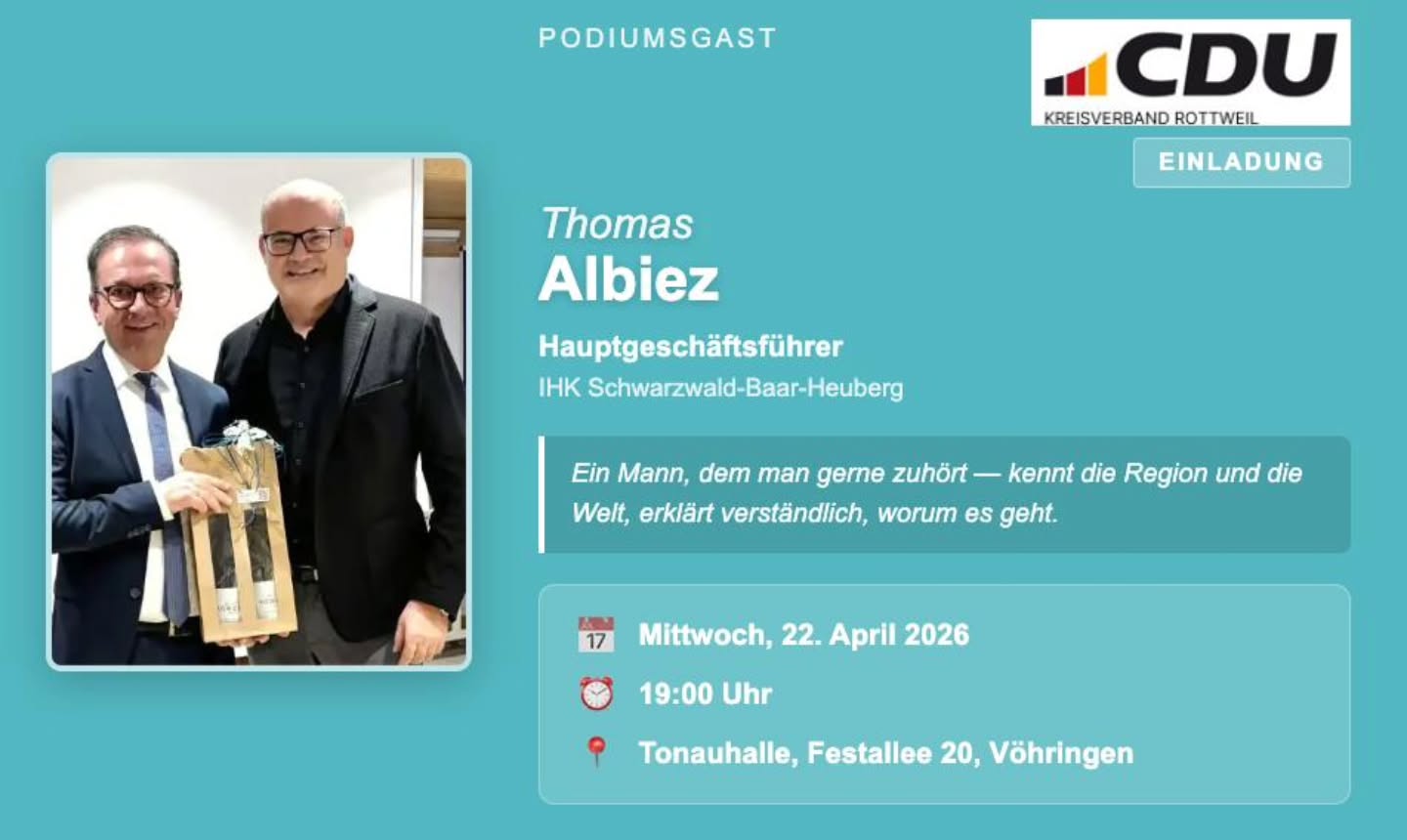 Ein starker Süden ist gut für Deutschland 🇩🇪 Darüber sprechen wir am 22. Februar um 18:00 Uhr in der Tonauhalle Vöhringen ? gemeinsam mit Klaus Holetschek MdL, Vorsitzender der CSU-Fraktion im Bayerischen Landtag und Stefan Teufel MdL, Landtagskandidat der CDU für den Kreis Rottweil. 👉 Lasst uns ins Gespräch kommen über die Zukunft unseres Landes, über Verantwortung, Sicherheit und Zusammenhalt. 📅 22. Februar | 18:00 Uhr 📍 Tonauhalle, Festallee 20, 72189 Vöhringen Wir freuen uns auf euch ? kommt vorbei, bringt Freunde mit und diskutiert mit! 💬🤝 #Vöhringen #StarkerSüden #GutFürDeutschland #PolitikVorOrt #ehrenamt